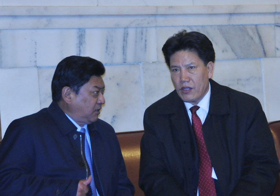 3月15日(星期五)上午9時,十二屆全國人大一次會議在人民大會堂舉行第五次全體會議,決定國務(wù)院總理的人選;決定中華人民共和國中央軍事委員會副主席、委員的人選;選舉最高人民法院院長;選舉最高人民檢察院檢察長。圖為西藏自治區(qū)人大常委會主任白瑪赤林(左一)和西藏自治區(qū)主席洛桑江村(左二)。宋君毅 攝