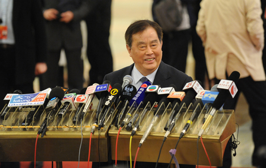 3月10日,第十二屆全國人民代表大會第一次會議舉行第三次全體會議,聽取最高人民法院院長王勝俊作最高人民法院工作報告;聽取最高人民檢察院檢察長曹建明作最高人民檢察院工作報告;聽取國務委員兼國務院秘書長馬凱關于國務院機構改革和職能轉變方案的說明;表決第十二屆全國人民代表大會第一次會議選舉和決定任命的辦法草案。圖為鐵道部部長盛光祖接受記者群訪。新華網/中國政府網 陳競超 攝