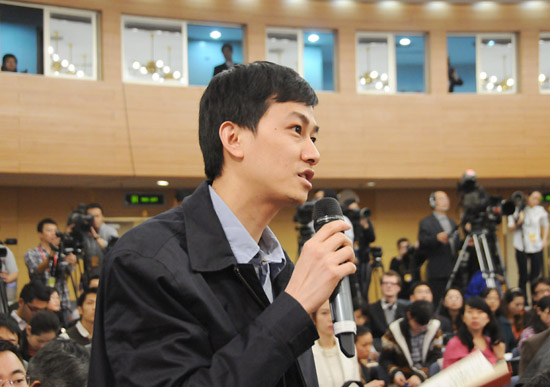 十二屆全國人大一次會議新聞中心3月8日上午10時在梅地亞中心多功能廳舉行記者會,商務部部長陳德銘就“發展國內外貿易和促進經濟合作”的相關問題回答中外記者的提問。圖為中國國際廣播電臺記者提問。新華網/中國政府網 翟子賀 攝