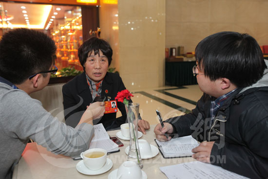十二屆全國人大代表、山東曹縣誠輝毛皮經貿有限公司業務經理、車間主任沙元菊就農村養老問題回答大眾網網友的提問。(大眾網特派記者 盛堃 攝)
