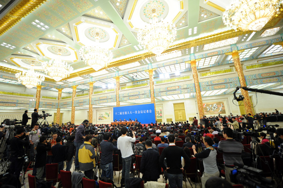 3月9日,十二屆全國人大一次會議舉行記者會,外交部部長楊潔篪就“中國的外交政策和對外關系”答中外記者問。這是記者會現場。新華網/中國政府網 陳競超 攝
