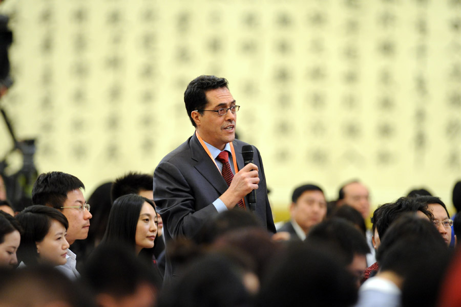 3月9日,卡塔爾半島電視臺(tái)記者提問。當(dāng)日,十二屆全國人大一次會(huì)議舉行記者會(huì),外交部部長楊潔篪就“中國的外交政策和對(duì)外關(guān)系”答中外記者問。新華網(wǎng)/中國政府網(wǎng) 陳競超 攝
