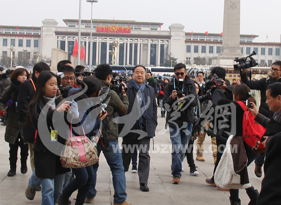 大眾網(wǎng)北京3月2日訊(特派記者 王磊)“莫言!快……”“截住他!”今天14時20分 ,在全國政協(xié)十二屆一次會議預備會開始前,全國政協(xié)委員莫言剛從大巴車上下來,就被一位持長焦鏡頭相機的記者發(fā)現(xiàn),隨著他一聲大喊,百余名記者全部沖了上去。大眾網(wǎng)記者在采訪時看到,從下車到進入會堂, 莫言一路之字形步行路線,僅百余米的路走了足足5分鐘,但是卻一言未發(fā)。