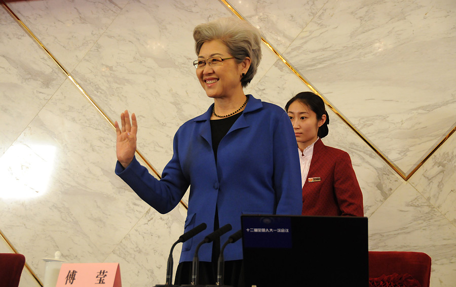 3月4日,十二屆全國人大一次會議在人民大會堂一層新聞發布廳舉行新聞發布會,由大會發言人就會議議程和人大工作相關的問題回答中外記者的提問。圖為十二屆全國人大一次會議副秘書長、新聞發言人傅瑩亮相。新華網/中國政府網 翟子赫 攝