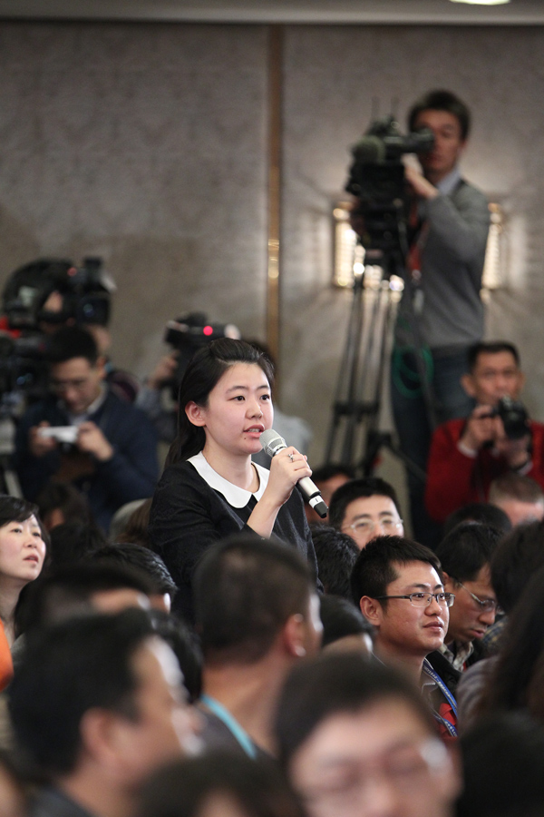 3月4日,十二屆全國人大一次會議在人民大會堂一層新聞發布廳舉行新聞發布會,由大會發言人就會議議程和人大工作相關的問題回答中外記者的提問。圖為中國日報記者提問。新華網/中國政府網 王悅威 攝