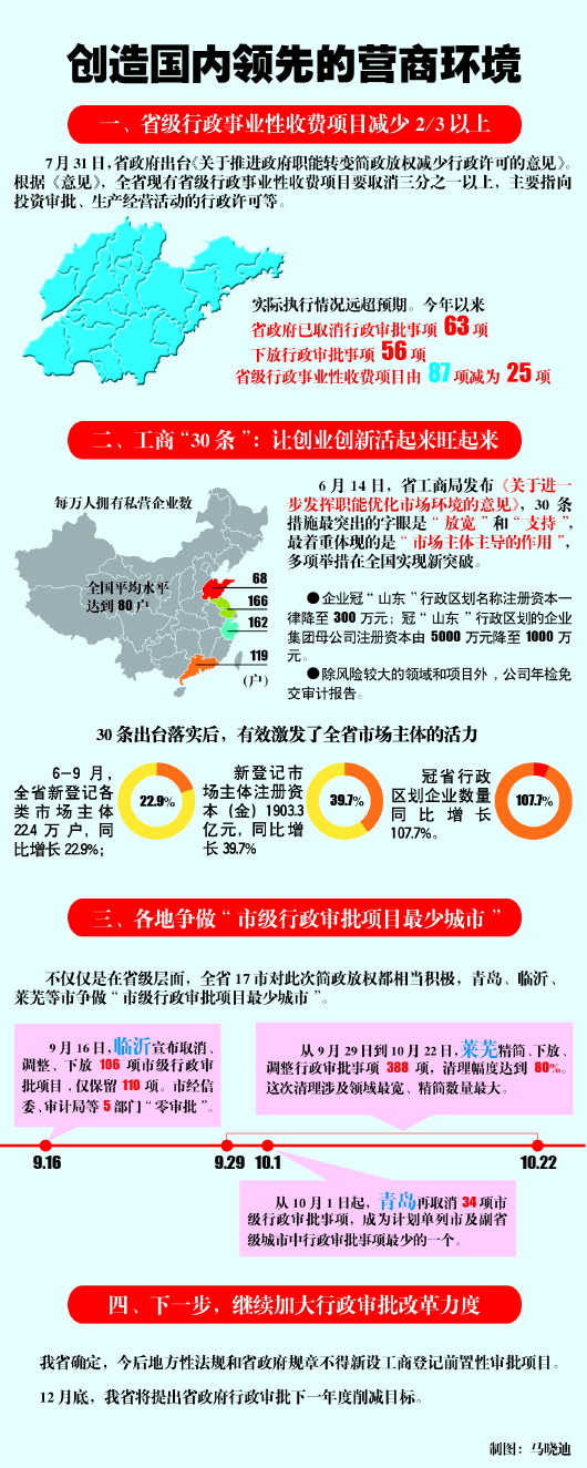 3月底,“創(chuàng)造國內(nèi)領(lǐng)先的營商環(huán)境”這一提法首次在山東出現(xiàn)。在短短7個月時間里,全省推進(jìn)政府職能轉(zhuǎn)變、減少行政許可、理順政府與市場關(guān)系,改革步伐大大超出預(yù)期。從管得多、管不好向管得少、管得好轉(zhuǎn)變,一場以簡政放權(quán)為主要內(nèi)容的政府職能轉(zhuǎn)變正在山東釋放發(fā)展活力。