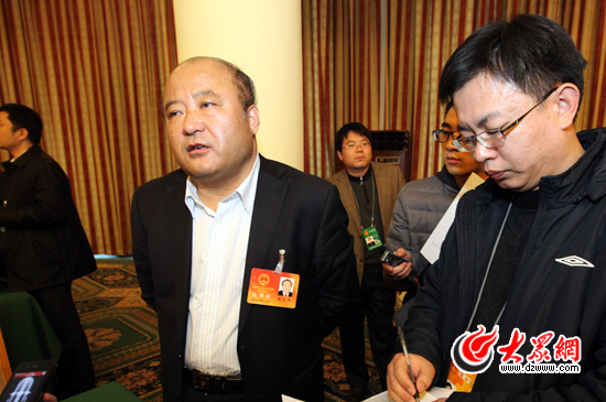 省人大代表、臨沂市委書記張少軍(左)接受大眾網記者采訪。(盛堃 攝)