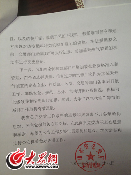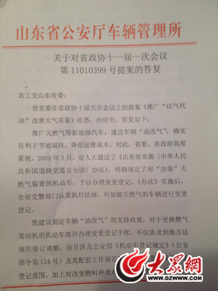 大眾網濟南1月29日訊記者 王磊)今天,我省部分地區又遭霧霾天氣。在省政協十一屆一次會議上,十一屆省政協委員王倫善建議,在全省城鎮進一步加大推廣“以氣代油”力度,以降低 PM2.5排放。今天下午,省公安廳車輛管理所有關負責人向其當面回復稱,私家車在指定廠家加裝“油改氣”設備的,交警部門按有關規定,對“加裝”天然氣裝置的機動車,予以辦理變更登記,但“以氣代油”尚待相關法規調整。