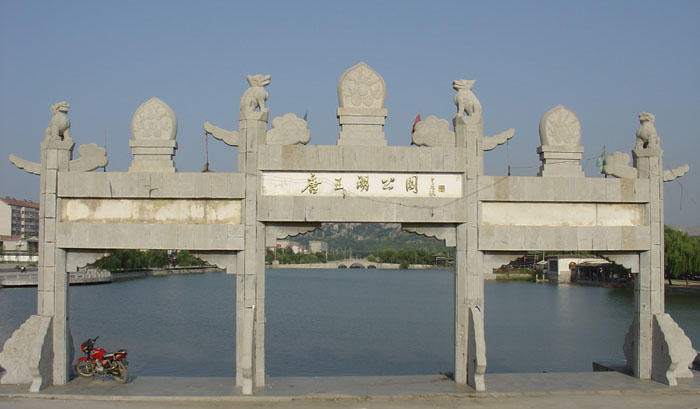 唐王湖位于鄒城市區(qū)南部,順河路和嶧山路的交匯處,北靠博物館,南臨唐王湖小區(qū),東依風(fēng)景秀麗的護駕山,西臨國家級重點保護單位孟廟、孟府。唐王湖上游有兩大水系注入,一是孟子湖涵洞之水滲為小溪,淙淙不斷,經(jīng)五龍?zhí)抖笞⑷氡芩欢翘仆跎剑玉{山水系,從九里澗、蛐蜒溝,九曲十八折,而后直接流進(jìn)唐王湖。唐王湖一稱,概因修建于唐王山下,加之唐王山水系注入湖中,故爾得其名。