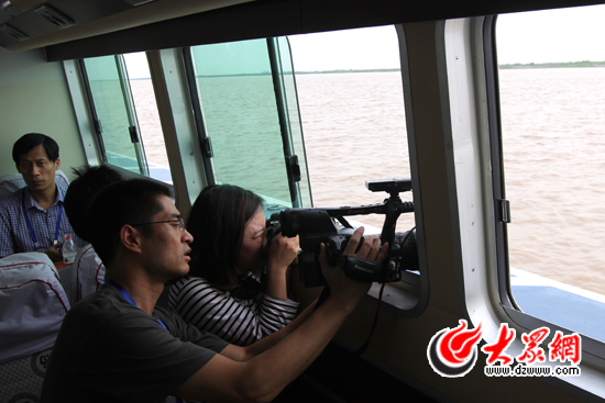 采訪團記者們在船上近距離拍攝黃河。大眾網(wǎng)記者 馬鑫 攝