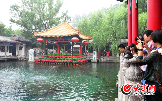 采訪團記者們紛紛舉起手中的相機,記錄趵突泉公園的美景。大眾網記者 馬鑫 攝