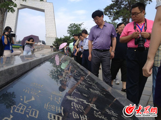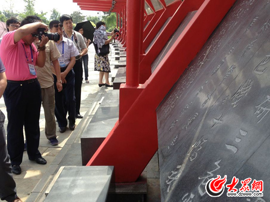 19日,南線媒體采訪團來到臨沂書法廣場,記者們仔細欣賞王羲之留下的臥碑書法。(大眾網(wǎng)記者 李兆輝攝)