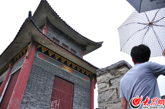 南線采訪團記者冒雨爬上齊長城錦陽關段關樓,遠眺中國最古老長城。(大眾網記者 熊戈措 攝)
