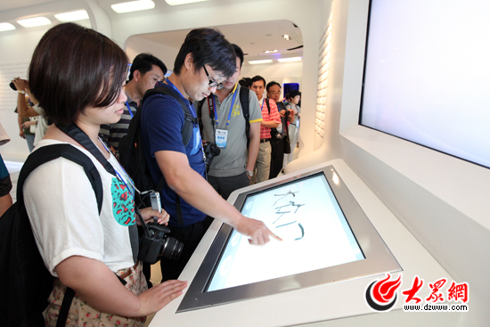 一名媒體記者在齊魯軟件園的電子智能簽名機上留言。大眾網記者 楊春衛 攝