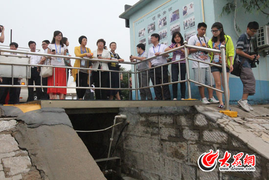 采訪團記者們查看泉林紙業的排水口,泉林紙業的污水處理排放標準高于歐美等發達國家。大眾網記者 赫洋 攝