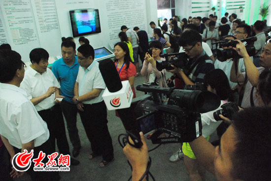 采訪團成員們觀看各大媒體對山東泉林紙業的報道情況。大眾網記者 郭豪 攝