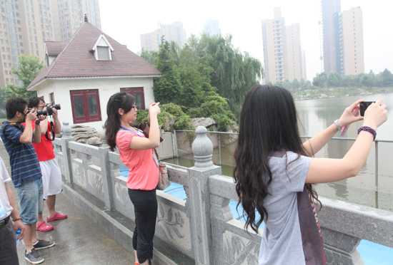 采訪團的記者們拍攝東湖公園的美景。 記者 郭豪攝