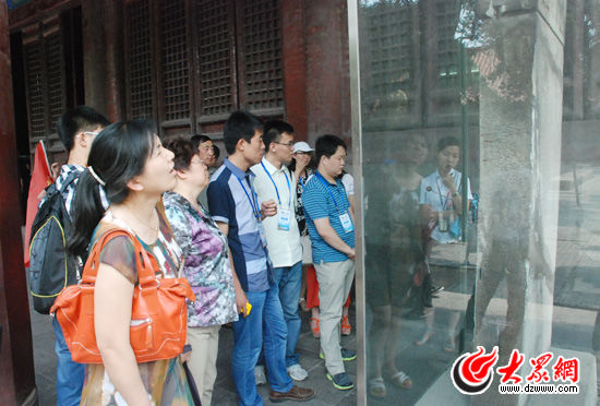 采訪團的記者們參觀奎文閣碑。(記者 郭豪攝)