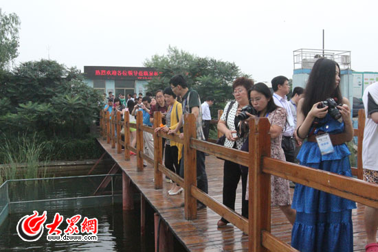 18日上午,“聚焦美麗山東——第九屆中國網絡媒體山東行”采訪團來到聊城市高唐泉林紙業,記者們正“圍觀”用經過處理的造紙廢水所養的魚。大眾網記者 赫洋 攝