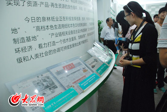 采訪團成員們觀看各大媒體對山東泉林紙業的報道情況。大眾網記者 郭豪 攝