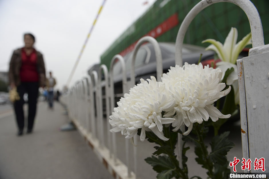 10月13日,北京石景山喜隆多商場(chǎng)火災(zāi)廢墟前,擺放有民眾為救火犧牲戰(zhàn)士獻(xiàn)上的鮮花,路人駐足圍觀。廖攀攝