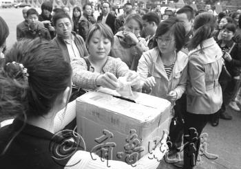 14日,北京石景山喜隆多商場的四百多名商戶踴躍為兩位英雄的家屬捐款。 本報特派記者 周青先 攝