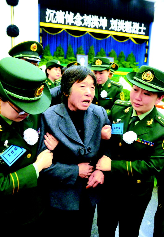 劉洪魁的父親劉克剛因剛剛住院,身體還沒有恢復,坐在輪椅上,他強忍悲痛。劉洪坤的父親劉貴廷不斷擦拭著已經哭紅的眼睛。兩位烈士妻子懷抱丈夫遺像,已經無法站穩(wěn)。
