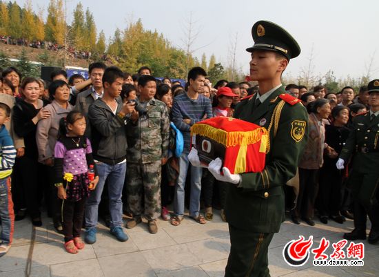 在劉洪坤烈士家鄉(xiāng)界河鎮(zhèn)二十里鋪村,靈車(chē)還未入村,附近村及二十里鋪村村民早早就在村口等候,當(dāng)靈車(chē)開(kāi)進(jìn)村口,鼓樂(lè)齊鳴,“嘭”一聲炮響,震懾天地,劉洪坤的鄉(xiāng)親鄰里用最傳統(tǒng)的方式與車(chē)同行,和烈士劉洪坤一起,走一趟“回家”的路。繞行一周后,在村民的注目下,劉洪坤的骨灰被送往滕州市烈士陵園。