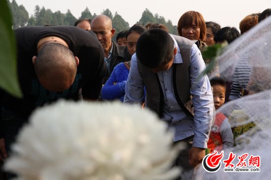 來(lái)此為英雄送行的上萬(wàn)名群眾,一一排好隊(duì),自發(fā)的將手中的鮮花,放到劉洪坤墓碑前。“知道今天要在這舉行安放儀式,我特地開(kāi)車(chē)趕過(guò)來(lái)的。從網(wǎng)上看到他的英雄事跡后,希望最后一程能夠送送他,用這束鮮花來(lái)祭奠我們滕州永遠(yuǎn)的英雄劉洪坤。”從滕州市區(qū)開(kāi)車(chē)20分鐘趕到現(xiàn)場(chǎng)的李先生說(shuō)。