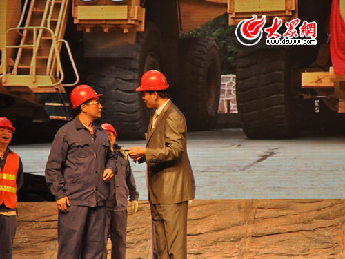 大眾網煙臺10月16日訊 (記者 鐘建) 在電閃雷鳴、暴雨傾盆的夜晚,剛剛獻完血,已經連續工作15個小時的郭明義出現在了搶修礦山公路的搶險現場……16日晚7時30分,根據郭明義事跡改編創作、由遼寧人民藝術劇院創作排演的現實主義話劇《郭明義》在煙臺廣電大劇院上演。