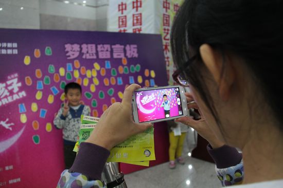 13日晚6點半,在日照市會展中心前,大批觀眾已經準備檢票。廣場前,小孩子們興奮和期待的喊叫聲,讓這個在秋天里略微安靜的小城,顯得熱鬧起來。晚上7點,離演出正式開場僅有半個小時,此時的演出廳內已經座無虛席。比起門口的夢想墻來說,似乎接下來的話劇更能吸引孩子們。