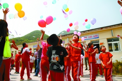 圖十:劇組與老峪溝中心小學的孩子們共同放飛載有夢想卡片的氣球。