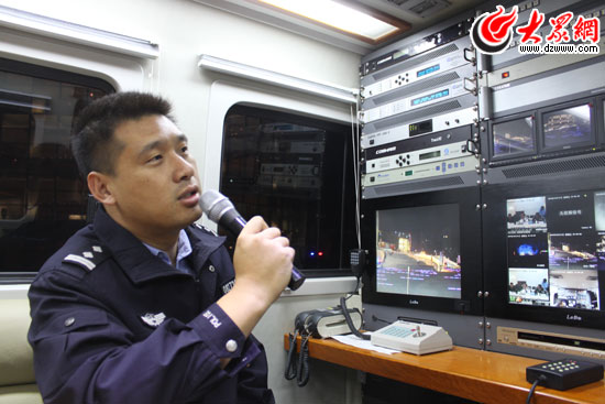 記者走上“動(dòng)中通”一探究竟。民警郭警官介紹說,車上安有4個(gè)監(jiān)控探頭,可360度旋轉(zhuǎn),車上可實(shí)現(xiàn)語音與圖像雙向傳輸,視頻圖像通過衛(wèi)星、微波信號(hào)與省市指揮中心連接,實(shí)現(xiàn)實(shí)時(shí)直播。“動(dòng)中通”還有擴(kuò)音與照明功能,民警通過擴(kuò)音器便可向外喊話。這輛車價(jià)值500余萬,2012年9月曾參與了民眾示威游行。