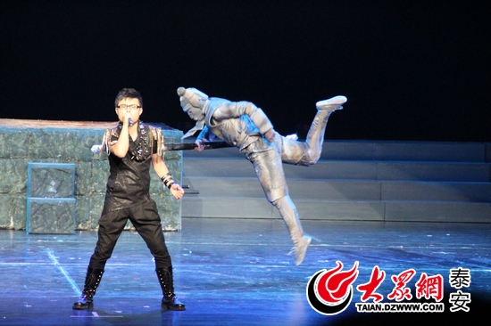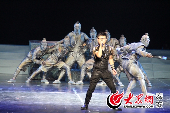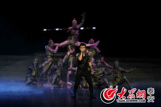 精心編排的《泰山石敢當(dāng)》在通俗偏搖滾的表現(xiàn)形式中間穿插了時(shí)髦的嘻哈說唱。(見習(xí)記者 張冉 攝影報(bào)道)