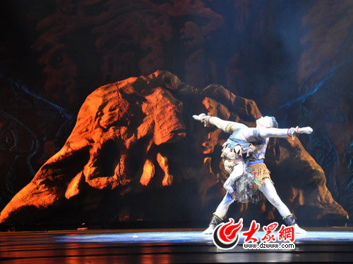 伴隨著時而悠揚、時而緊張驚險、時而哀傷的音樂,一群身披獸皮手執石器的“原始人”在舞臺上用他們的肢體訴說著康家石門子巖畫上的古老故事,這就是正常劇目的第一幕《天石之靈》。這段仿古舞蹈以康家石門子、阿克蘇鄉巖畫為主要背景,通過質樸的舞蹈敘事,形象的表現了新疆土地上原始先民強烈的生命意識和生存意識。第二幕《天池之戀》中,一陣行云流水般的樂聲傳到觀眾的耳邊,天藍色的背景幕升起,上面綴滿了點點繁星簇擁著一輪彎月。身著白衣的舞蹈演員踏著芭蕾的舞步,款款飄上舞臺。舞蹈以寧靜秀美的天池為背景題材,以哈薩克族音樂元素、舞蹈元素與古典芭蕾相結合,通過對天池之水和星空明月的寫意,喚起人們對天池神秘傳奇的向往,和對美好愛情的追求。