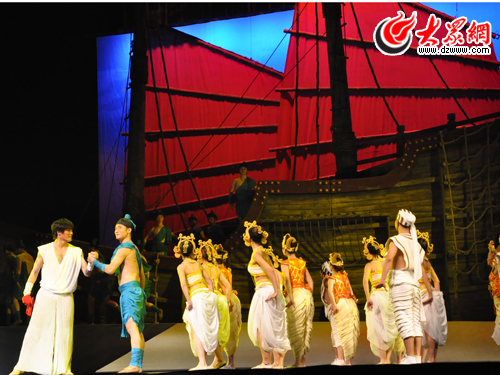 海螺聲聲,鼓聲陣陣,大紅的風帆徐徐揚起。21日晚,中國第一個海洋性題材的外向型、開放型作品,舞劇《碧海絲路》在十藝節煙臺分會場的牟平文化中心大劇院與市民們見面。