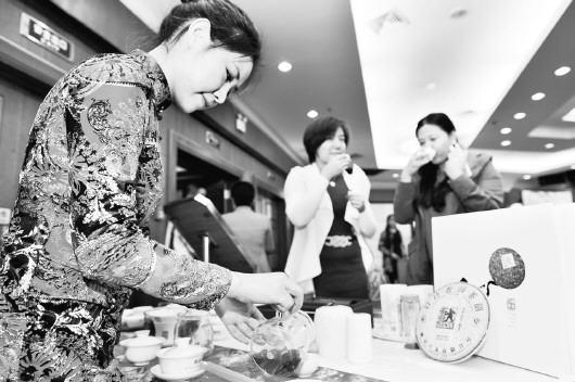 10月16日,“古道丹青 墨韻普洱”舒建新中國畫展新聞發(fā)布會現(xiàn)場,參會人員在品嘗地道云南普洱茶。 □王世翔 報(bào)道