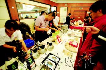 舒建新中國畫展新聞發(fā)布會(huì)后,與會(huì)者參觀普洱咖啡的沖泡過程。 本報(bào)記者 戴偉 攝