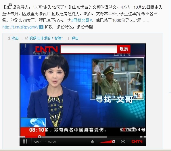 10月29日,煙臺(tái)大眾網(wǎng)在在官方微信、論壇上轉(zhuǎn)發(fā)了尋找譚洪文的消息,并采訪了其姐姐譚春玲,并在煙臺(tái)當(dāng)?shù)鼐W(wǎng)絡(luò)媒體中,率先刊發(fā)了《"文叔叔"走丟牽動(dòng)全城愛心 網(wǎng)友接力尋人》一文,在發(fā)動(dòng)網(wǎng)友尋人的同時(shí),講述了譚洪文走失引發(fā)全城尋找的愛心故事。