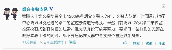 大眾網(wǎng)煙臺(tái)11月7日訊(通訊員 袁圣凱 李娜 記者 林有權(quán))“文哥”走失牽動(dòng)著全市1200余名煙臺(tái)交警人的心。煙臺(tái)市公安局交警支隊(duì)第一時(shí)間通過微博、QQ、微信等媒介跟進(jìn),追尋這位編外交警。交警支隊(duì)第一時(shí)間通過指揮中心調(diào)取可能經(jīng)過的路口的監(jiān)控錄像進(jìn)行尋找,又協(xié)調(diào)牟平大隊(duì)通過監(jiān)控視頻尋找他的下落,雖然目前調(diào)取120余路口錄像監(jiān)控還沒有找到有價(jià)值的線索,但支隊(duì)并沒有放棄努力,要求每一位執(zhí)勤的民警在做好本職工作的同時(shí),都不要忘記在人群中尋找那個(gè)曾經(jīng)熟悉身影。