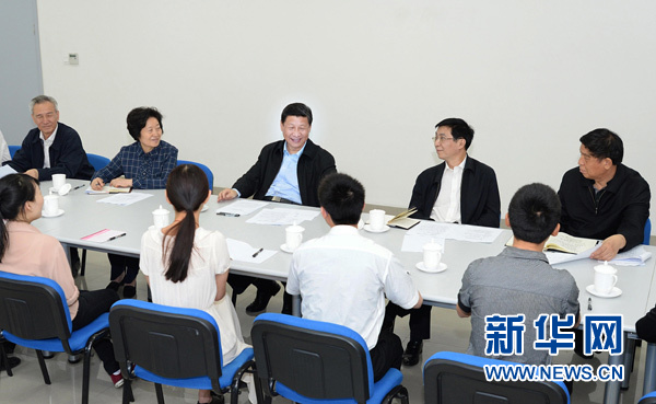 5月14日至15日,中共中央總書記、國家主席、中央軍委主席習近平在天津考察工作。這是習近平在天津職業技能公共實訓中心與高校畢業生、失業人員、農村富余勞動力代表座談。