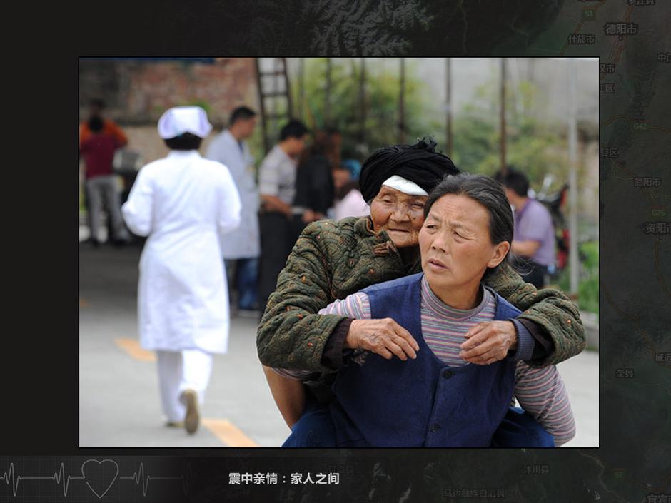 2013年4月21日,雅安市蘆山縣,一名頭發半百的婦女背著一名老奶奶前來接受治療。