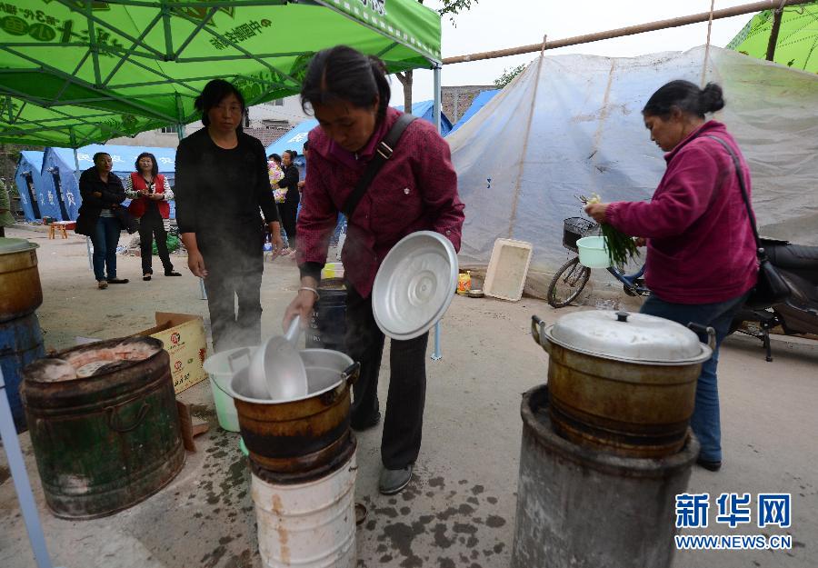 4月23日,在四川省蘆山縣一個受災群眾安置點,人們在準備早飯。 新華社記者李鋼 攝