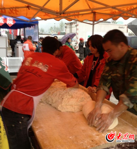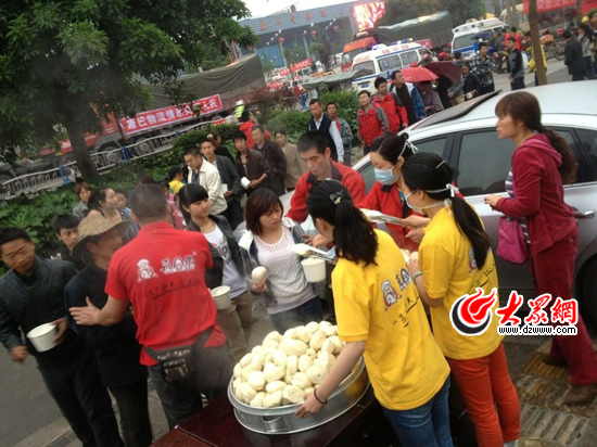 23日早,蘆山縣城區及周邊震區群眾冒雨在街頭領饅頭。特派記者 李兆輝 攝