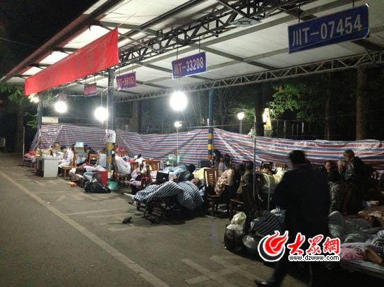 21日凌晨3點,大眾網記者趕到雅安市人民醫院。大眾網記者看到,該院院內已經搭建起收治病人的臨時帳篷。為了給地震中受傷的百姓騰出床位,不少病情較輕的病人被轉移到臨時帳篷內。