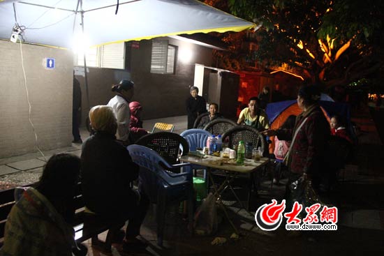 余震發生后,雅安市眾多市民紛紛從家中跑出來,在開闊處避震。市民嚴女士說,為了避險,她們一家人一直沒敢睡,只在沙發上打了會盹。當時感到地面震動時,他們一家趕忙跑了出來。