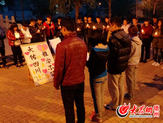 大眾網德州4月21日訊(記者 翟巖 通訊員 金翠萍 )為悼念四川雅安地震遇難同胞,緬懷逝者寄托哀思,4月20日,德州學院地理系大學生們舉行了以“天佑四川,雅安不哭”為主題的燭光悼念活動。
