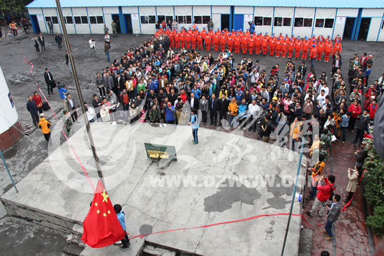 今天是地震過后,蘆山縣國張中學(xué)首次復(fù)課。上午10點,學(xué)校初三年級的187名學(xué)生在操場上舉行了一場特殊的升旗儀式。身后的板房是愛心組織搭建的活動板房,用作學(xué)生教室。沒有伴奏,大家就一起清唱國歌;旗桿晃動,就用繩子固定住。大眾網(wǎng)特派記者尹海洋 攝