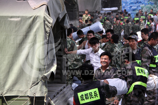 4月25日上午10點(diǎn),來(lái)自成都市浦江縣的民兵在忙著為前往寶盛鄉(xiāng)的車(chē)輛裝帳篷。此時(shí),他們累并快樂(lè)著。大眾網(wǎng)特派記者尹海洋 攝