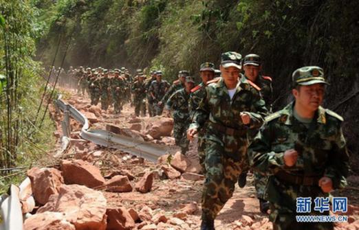 4月20日,因地震造成山體滑坡,道路受阻,救援人員徒步趕往救援現(xiàn)場。記者剛剛從四川省地震局獲悉,截至20日16時40分,雅安蘆山地震已造成四川113人死亡。具體傷亡人數(shù)仍在進一步統(tǒng)計中。 新華社記者陳燮 攝
